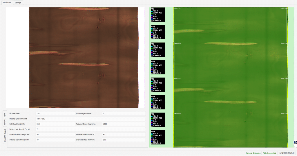 A questo si aggiungono l’elevata velocità della linea di sfogliatura, le condizioni di illuminazione non sempre uniformi e la necessità di correlare con precisione millimetrica ogni difetto alla posizione esatta sul pannello, così da ottimizzare le successive operazioni di taglio.
